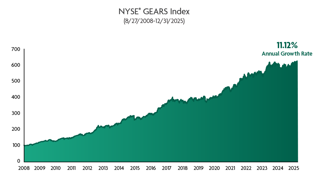 Index performance from 8/27/2008 through 12/31/2025. The index performance shown is hypothetical and for illustrative purposes only and does not represent the performance of a specific product. The NYSE GEARS Index was established on 7/1/2025. Performance before this date is back-tested. Hypothetical performance is back-tested by applying the Index methodology to historical financial data when all components were available and was designed with the benefit of hindsight. Back-tested performance is hypothetical and has been provided for informational purposes only. Past performance is not a guarantee of any future performance.